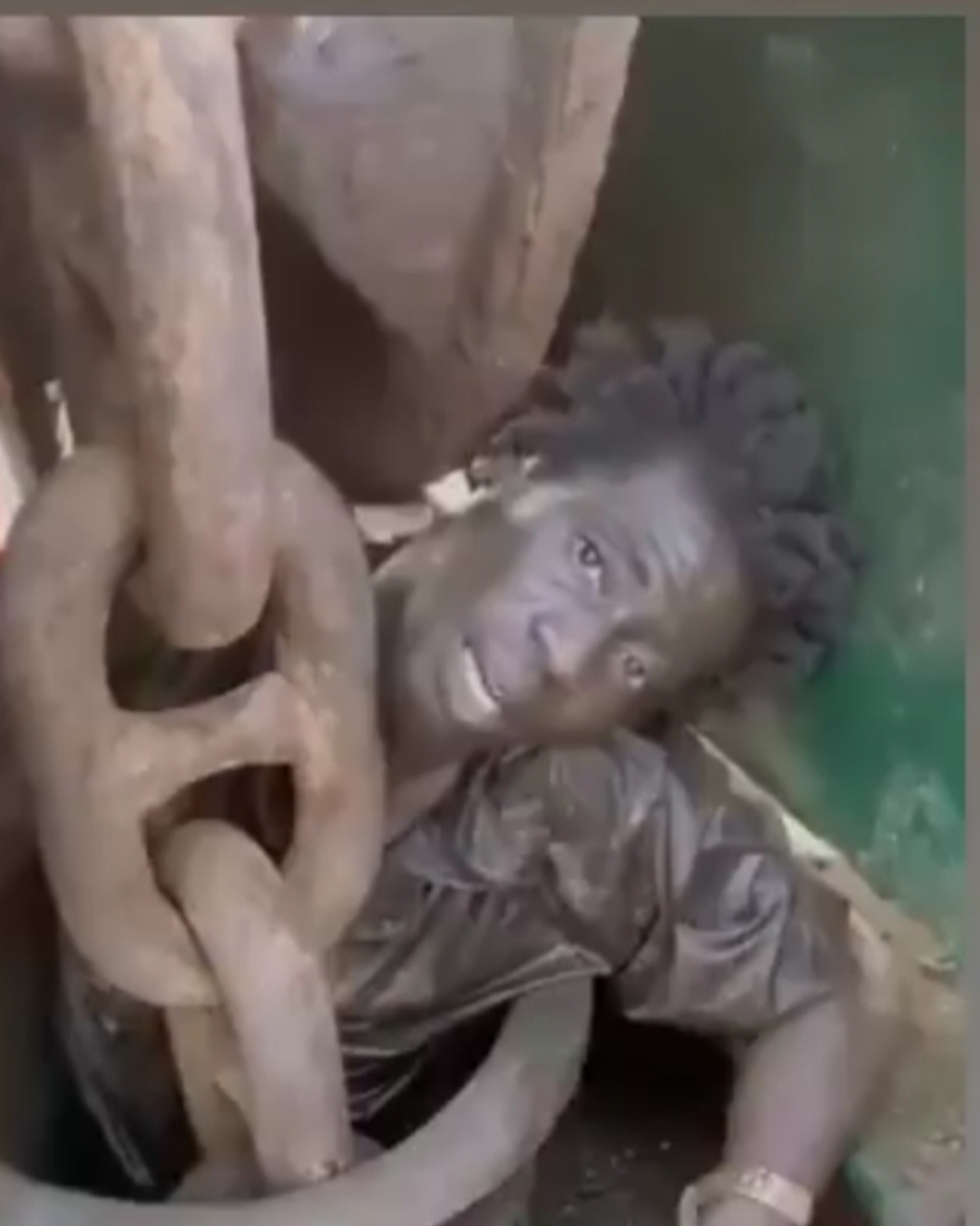 According to the video circulating online, the man’s head was already out of the hole, but he was too weak to pull the rest of his body free. Another man on board encouraged him to keep trying, assuring him that once his head was out, the rest of his body would follow.